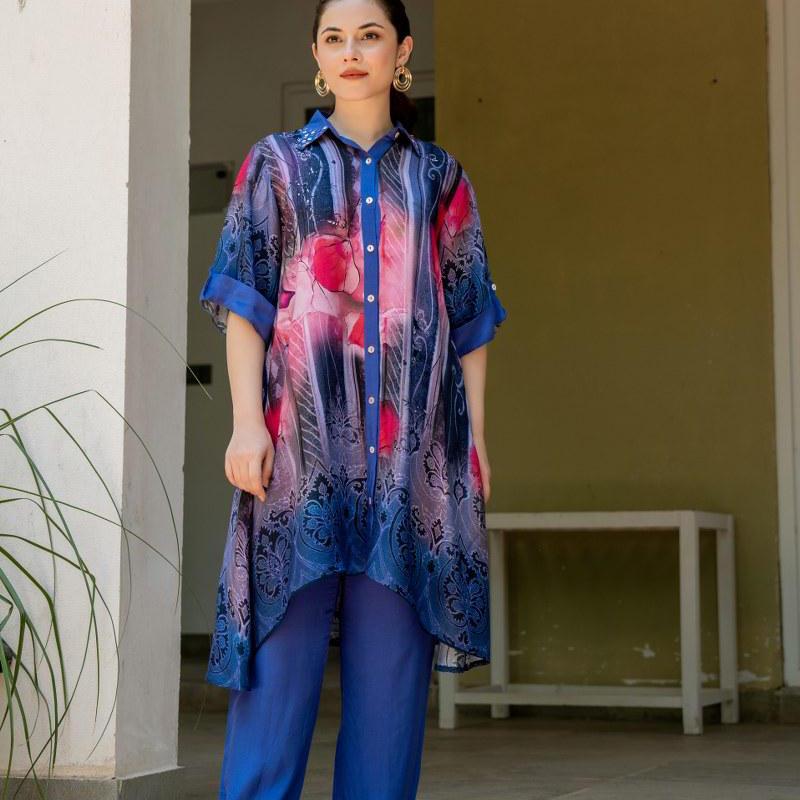 This co-ords consist of tunic and trousers Blue,pink and grey Printed tunic,has shirt collar neck,three quarter sleeves,regular waist hem.